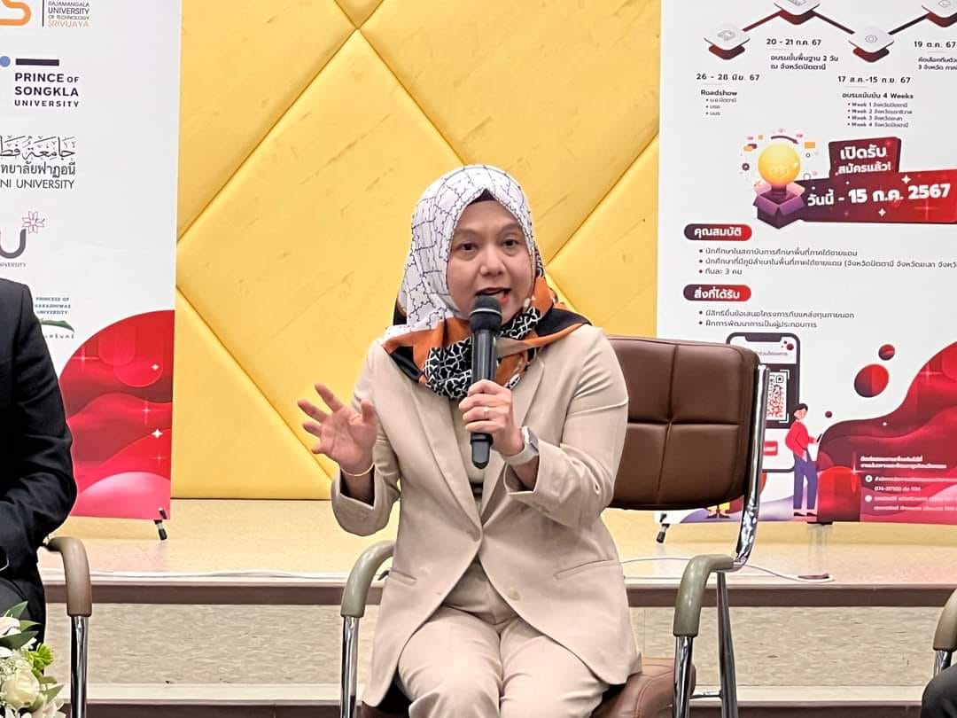 และท่านสุดท้าย ผศ.ดร.รักชนก ภูวพัฒน์ ผู้ช่วยอธิการบดีฝ่ายพัฒนาผู้ประกอบการ ผู้แทนจากมหาวิทยาลัยนราธิวาสราชนครินทร์
